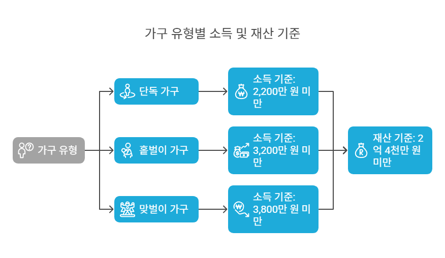 2025년에는 소득 기준과 재산 기준에 약간의 변동이 생겼습니다. 단독 가구는 연 소득 2,200만 원 이하, 홑벌이 가구는 3,200만 원 이하, 맞벌이 가구는 4,400만 원 이하로 기준이 조정되었습니다.